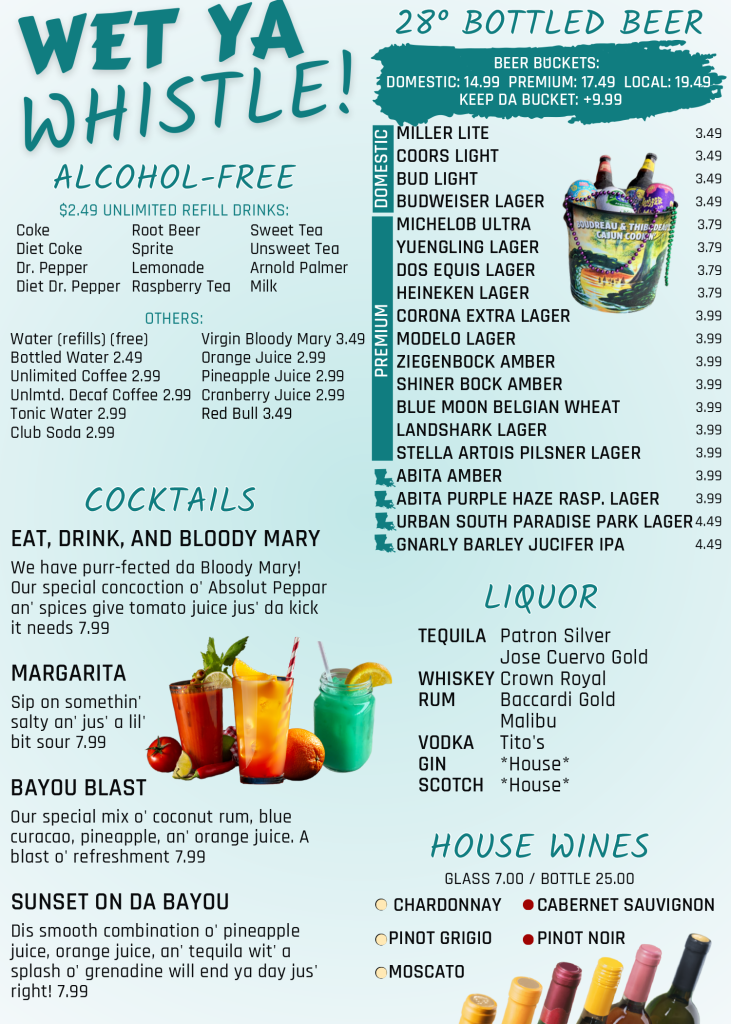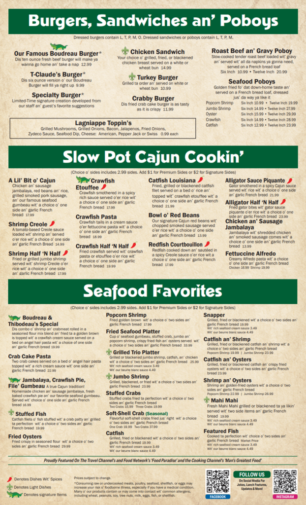 Our Menu Boudreau & Thibodeau’s Seafood Restaurant Cajun Cookin’ at its Finest Serving up South Louisiana’s Best Cajun Cookin’ in an atmosphere as Down Home as the Food! Indoor an’ Outdoor Seating available 985-872-4711 DOWNLOAD OUR MENUS Want to save our menu to your phone? Click on dem links below to download. FULL MENU KIDS MENU PARTY PLATTERS